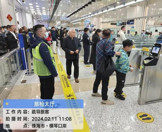 相較往年,今年春節(jié)橫琴口岸呈現(xiàn)出客流高峰提前、持續(xù)時間長、出入高峰疊加等特點,2月11日至16日(大年初二至初七)連續(xù)6天出入單向客流均超過3萬人次。其中,2月12日(大年初三)橫琴口岸單日客流超8.2萬人次,創(chuàng)橫琴口岸成立以來歷史新高。為應(yīng)對春節(jié)期間口岸高位客流,珠海大橫琴口岸實業(yè)有限公司(下稱大橫琴口岸公司)節(jié)前召開專題會議,提前部署應(yīng)急人員、物資、設(shè)備等通關(guān)安全保障;春節(jié)期間,根據(jù)客流量變化,大橫琴口岸公司通過科學(xué)增加人力、設(shè)置蛇形緩沖通道、屏幕投放指引等措施,多管齊下加強出入境旅客分流引導(dǎo),防止因高客流量發(fā)生擁擠、踩踏等治安事件的發(fā)生。另外在現(xiàn)場設(shè)置“特別通道”,為老人、孕婦和殘疾人等行動不便的旅客提供便利,并設(shè)置了醫(yī)療救援,以備過關(guān)旅客有不時之需。