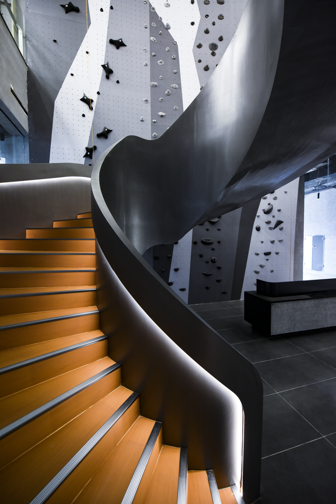 11樓設置了多功能室(可容納300人)、大小會議室、洽談室等,中庭與12樓相通,設置了旋轉(zhuǎn)樓梯和攀巖墻,寓意企業(yè)步步高升,體現(xiàn)企業(yè)家永攀高峰的精神。12樓主要以企業(yè)服務區(qū)、會客室為主。