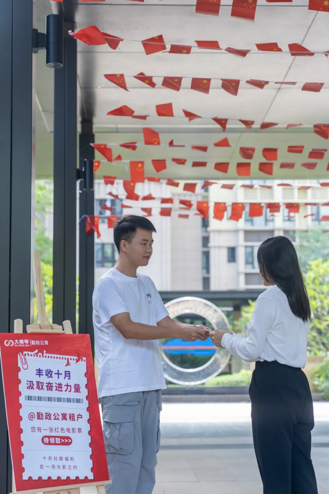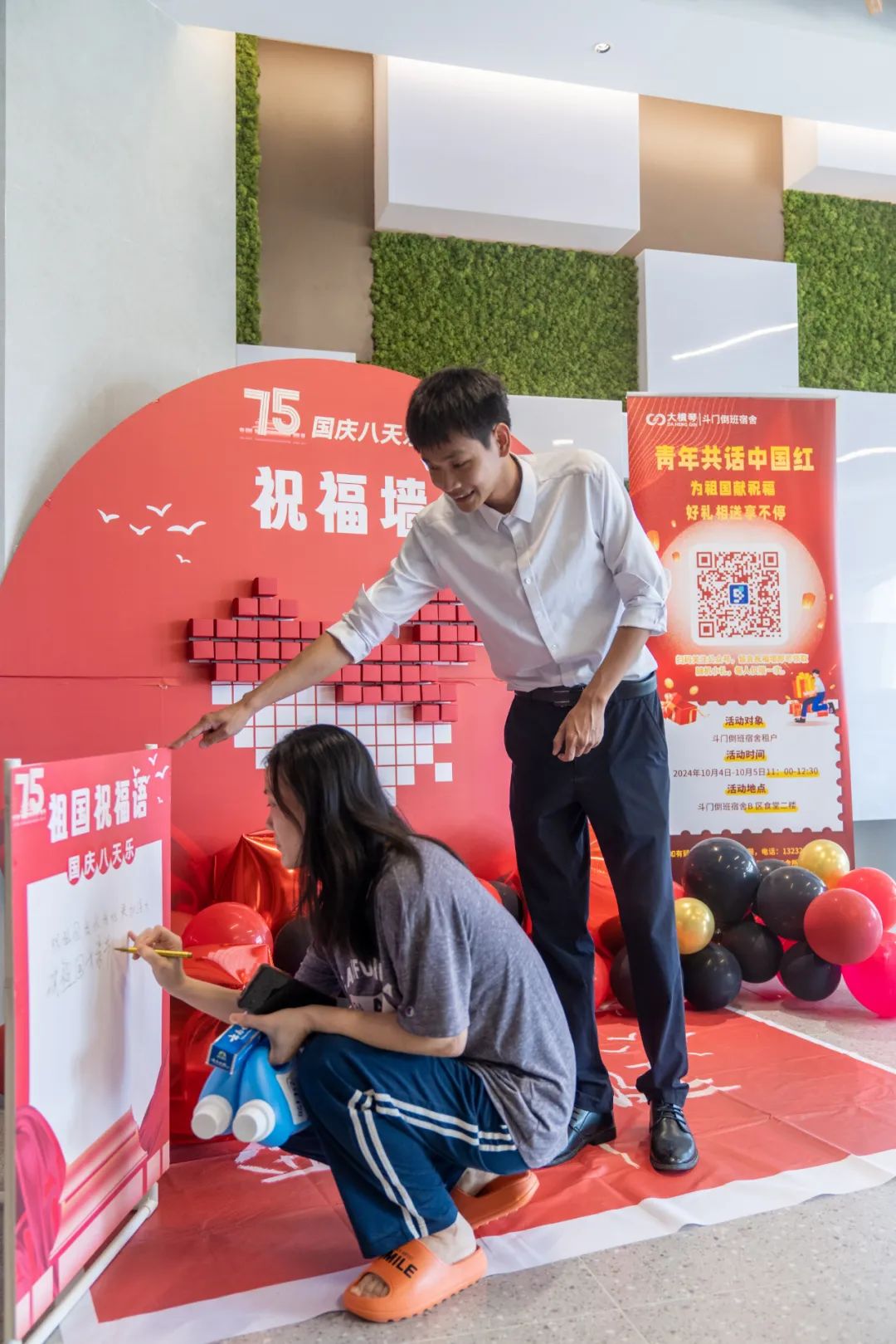 此外,大橫琴泛旅游公司也在旗下運營的多個公寓項目推出國慶特色主題活動,陪伴假期留駐的住戶們度過一個喜慶、歡樂的國慶佳節(jié)。國慶黃金周期間,勤政公寓開展了“豐收十月 汲取奮進力量”活動,通過播放免費電影豐富住戶生活,傳播奮進力量;斗門大橫琴5.0產業(yè)新空間倒班宿舍也開展了 “青年共話中國紅”國慶主題抽獎活動,設置留言祝福墻,以青春之言,表白祖國。