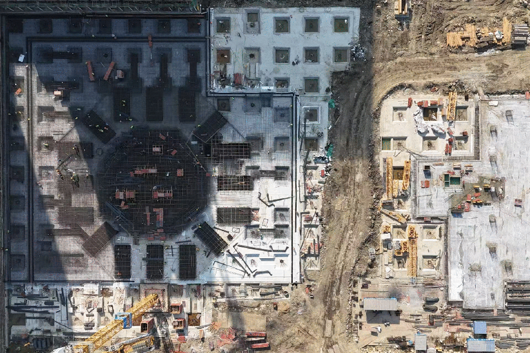 橫琴科學(xué)城(三期)項目工程特色鮮明、建設(shè)規(guī)模大、技術(shù)要求高、重點難點多,本次澆筑的K2棟底板大體積混凝土,是項目諸多技術(shù)重點難點中首個正式實施的。K2棟塔樓建筑高度149m,塔樓區(qū)域底板面積約4700㎡,底板厚度1.8m,承臺厚度3.8m,核心筒局部最深7.34m,鋼筋用量約1100t,混凝土約10000m3。本次混凝土澆筑量約1250車,投入5臺泵車“多管齊下”,歷時72小時,這是一次對專業(yè)技術(shù)和施工組織的雙重考驗。
